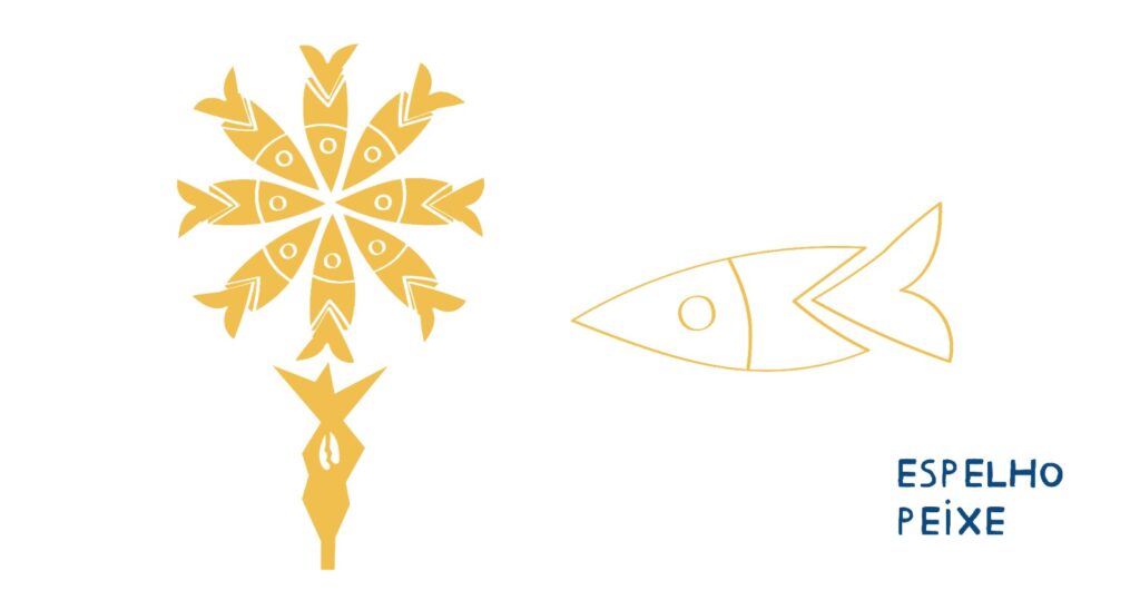Já a paleta de cores dialoga com a orixá Oxum, divindade da mitologia africana associada à fertilidade, à sabedoria e à criação. O amarelo-ouro, os peixes e os formatos espelhados evocam essa simbologia, enquanto o azul e as linhas curvilíneas remetem ao Oceano Atlântico, em referência à travessia forçada e às rupturas provocadas pela diáspora africana.